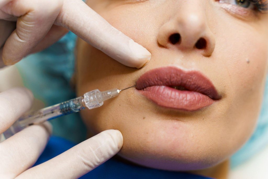 Closeup portrait injection on lips of pretty woman during botox procedures in salon. Professional work, rejuvenation, modern medicine, making beauty, healthcare.